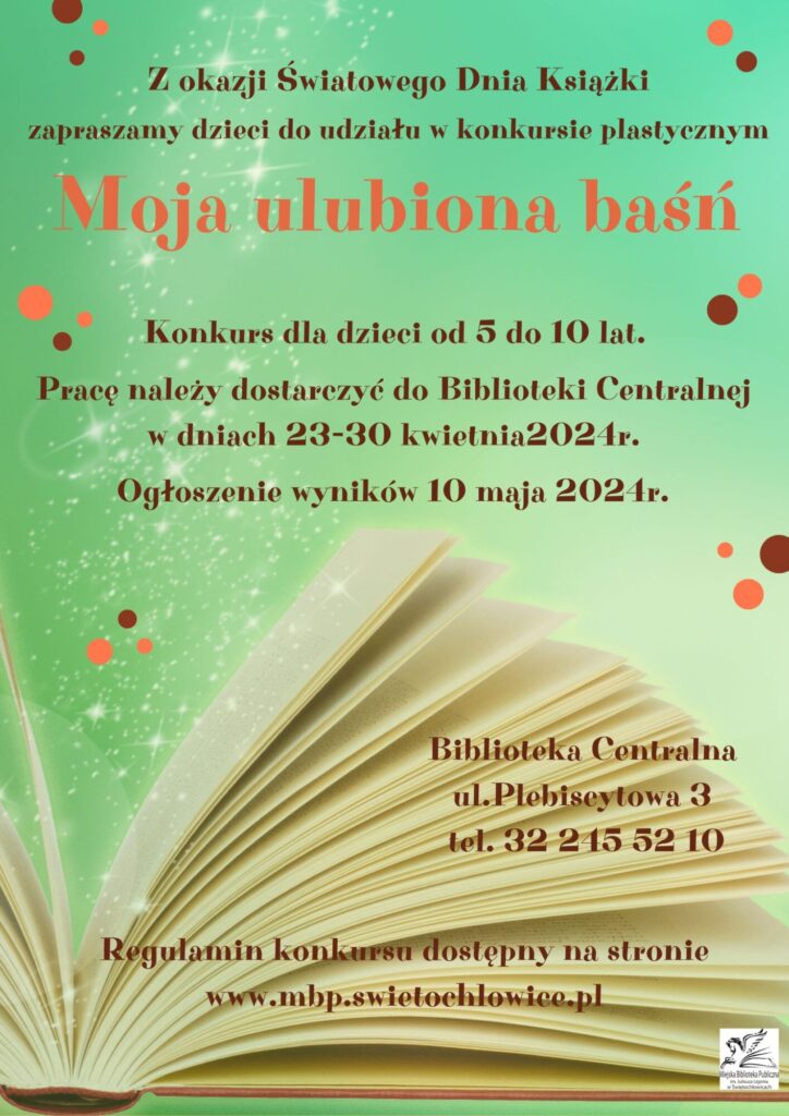 Z okazji Światowego Dnia Książki zapraszamy dzieci do udziału w konkursie plastycznym zatytułowanym „Moja ulubiona baśń”. Konkurs skierowany jest do dzieci w wieku od 5 do 10 lat. Pracę należy dostarczyć do Biblioteki Centralnej w dniach od 23 kwietnia do 30 kwietnia 2024. Zwycięzców poznamy 10 maja 2024. Szczegółowy regulamin wraz z kartą zgłoszeniową oraz zgodą na przetwarzanie danych dostępny jest na naszej stronie internetowej.